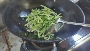 锅里留油,下入青椒爆炒,等青椒变色,加入肉丝翻炒均匀,装盘出锅
