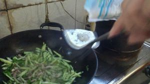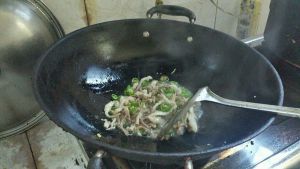 油热,放入腌好的肉丝,赶紧用锅铲铲开,避免粘住,因为有淀粉嘛。炒个一分多钟,放入青椒,再炒个一分多钟,就可以放盐,味精,起锅了。