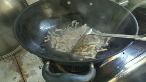 锅中放入适量的油把葱和生姜放入,炸黄捞出,下入肉丝,快速滑炒,加入老抽,装出