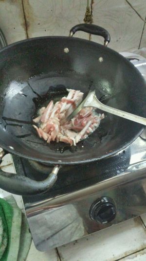 趁腌肉的时候开始切青椒,青椒切成细丝,细一点好吃一点。切完青椒就可以开始炒了。