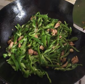 放入青椒丝,大火翻炒至青椒丝变软,加盐调味即可。