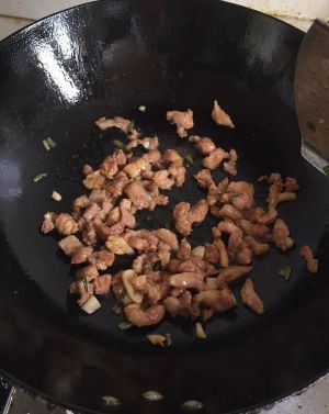 葱姜蒜下锅炒出香味后倒入腌过的肉丝,翻炒炒到变色断生,好香啊
