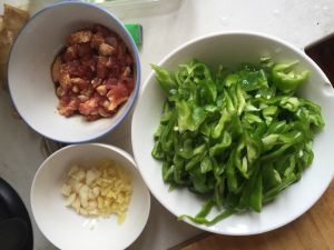 把五花肉切成肉丝,放入生抽腌制5~6分钟,青椒切丝,准备好姜蒜