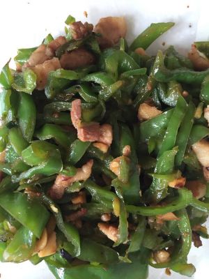 把肥肉在锅中炒出油,放入瘦肉,翻炒到肉变色,倒入青椒和蒜苗梗,炒两三分钟后加入盐、豆瓣酱和鸡精,就可以出锅了。