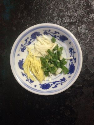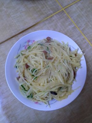 将土豆切丝后放烧开水的锅内煮3分钟(此时间段可以用锅铲翻动)然后倒出用冷水冲至冷却 晾干水。