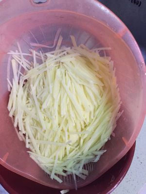土豆清洗干净,切成丝用清水冲洗,洗掉淀粉,备用。
