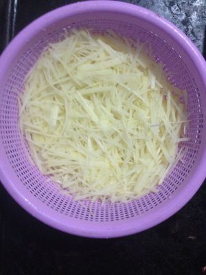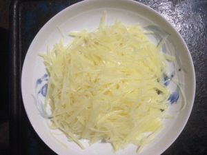 将土豆的皮刨掉,切丝(也可以用擦子擦),泡在水里去淀粉(防止土豆变黑)