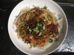 放入事先准备好的所有佐料,这样一盘可口的凉拌酸辣土豆丝就做好了。(花椒油可根据自己的口味放入)