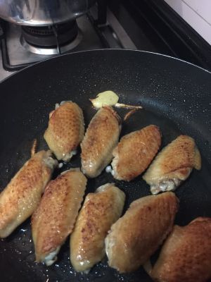 不粘锅里加入少许油,油热后放入鸡翅,用中小火煎香,如果用的普通铁锅,刚放入鸡翅的时候最好晃动一下锅子,这样鸡翅就不会粘锅了。