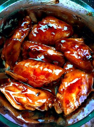 收汁好后捞出来。看好啦,摆盘,可以给盘子做个蔬菜花边会更好看好吃。因为很多人不喜欢吃可乐鸡翅得太甜。我就把可乐鸡翅把版本变了下。味道很像蜜制鸡翅。适合大众口味。肉很嫩也适合老年人哦。