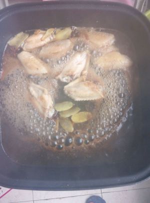 把煮过的鸡翅沥干,锅里放油,加入鸡翅翻抄,加入姜,酱油,然后加入可乐,淹没鸡翅,在放一些糖