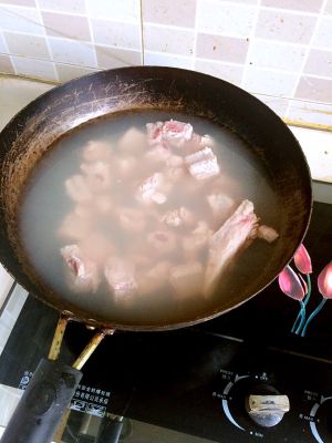 锅里添水,水温之后就下排骨,水不要太热,不然肉会特别老,下锅等水开哦