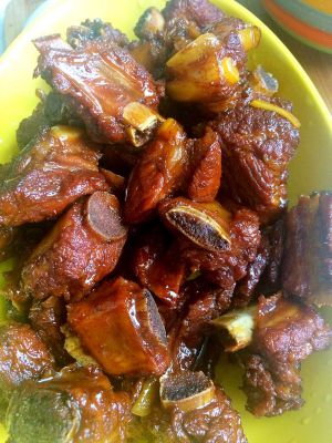 大火烧开后转至小火慢慢烧至排骨粑软,然后夹去锅里的葱和大块头的香料