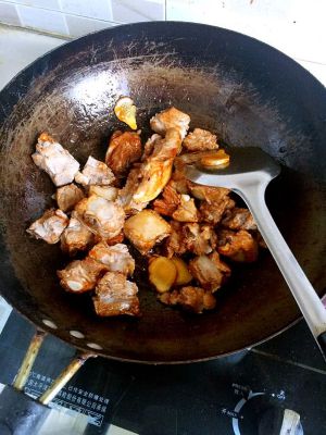 待糖水开始变成棕红色,且开始冒棕红色的泡沫时,马上把排骨倒入锅中炒匀,接着放入姜片,花椒和各种香料