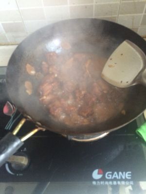 炒出香味后倒入少许料酒和酱油上色,掺入清水,加入盐和葱结