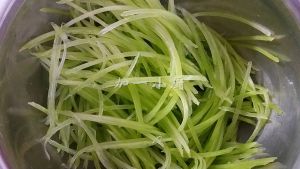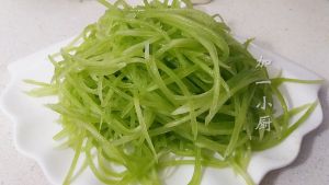 莴笋切丝,洒少许盐,稍稍的腌一下,腌出水分,避免凉拌时水分过多,还可减少生莴笋的味道;