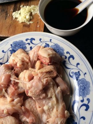 将鸡肉块中加入盐和料酒并搅拌均匀。腌制至少半小时。