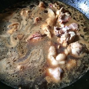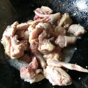 开小火将锅烧热,倒入油。加入鸡肉块翻炒。不要倒入腌鸡肉的料酒,尽量用油爆。