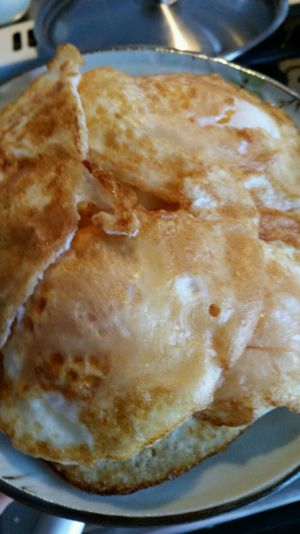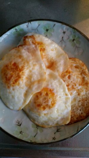 将第2枚鸡蛋磕入,一起煎制。(由于锅不够大,第3枚只好单独煎制了)。