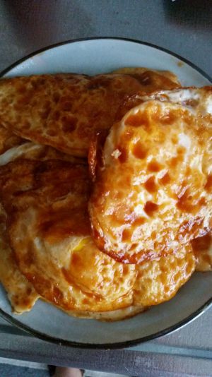待鸡蛋一面凝固上色后,翻面。两面均呈金黄色,且蛋黄凝固时即可出锅。