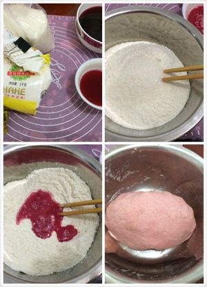 准备好所有材料,将面粉加入白糖,搅拌均匀,倒入放好酵母的苋菜汁,用筷子搅成絮状,用手团成光滑的面团,盖上湿布发至两倍大。