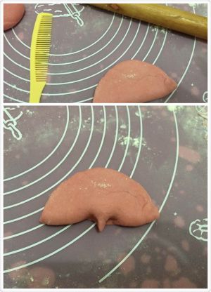找一把干净的梳子压出三条长的花纹,再用叉子压出四条短花纹。