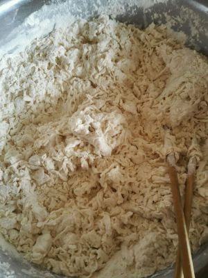 慢慢加入温水搅拌成絮状后 反复揉搓面团至表面光滑