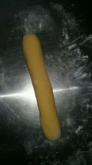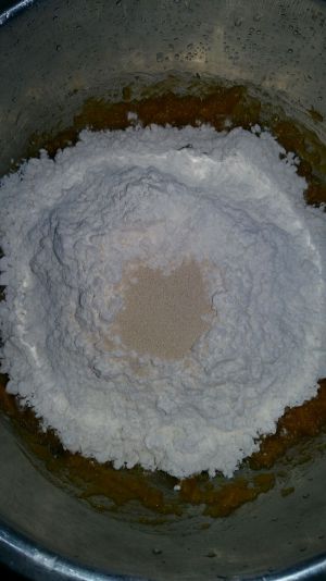 发酵时间到后将南瓜泥混入发酵好的面团中揉匀