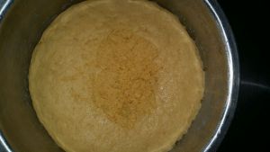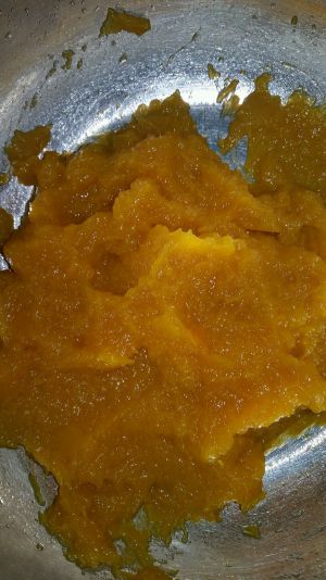 蒸熟的南瓜水倒掉,南瓜加糖用勺子压成泥。