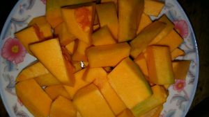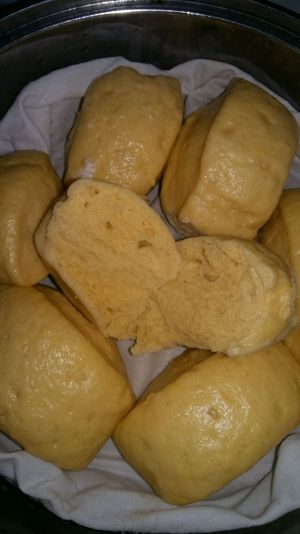 发酵的同时蒸南瓜泥,南瓜去皮切片放蒸锅里蒸二十分钟就好了,取出用擀面杖压成泥晾一下蒸发一些水份