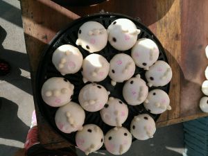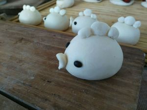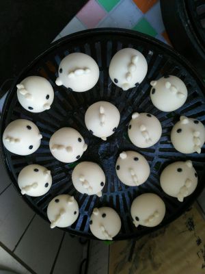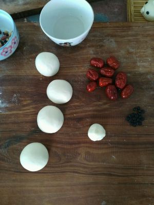 再把另外准备好的小面团分成几份,搓成小的面团当做小鸡的鸡冠摆到包了红枣的馒头中间,拼成鸡冠的样子,再把黑豆当成小鸡的眼睛粘在馒头的两边,最后再把一小团面捏成嘴巴的形状粘上。