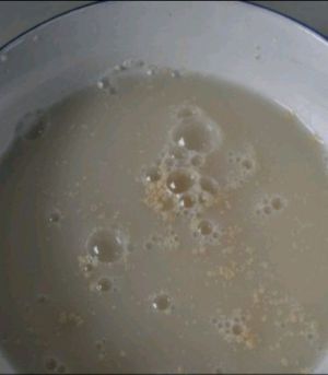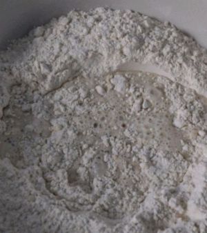 面粉加入冷了的发酵水拼命的揉捏搓,直到揉成个球,面球不会粘盆就可以了。