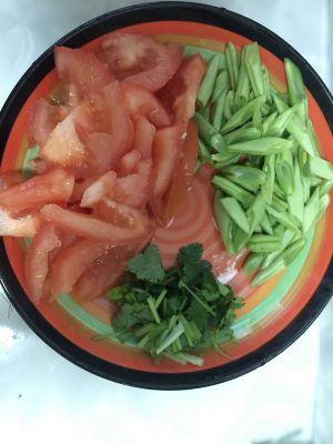 食材准备,番茄中等个头,斜切块。四季豆斜切段,香菜切小段。