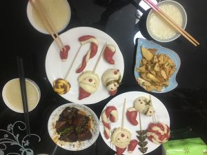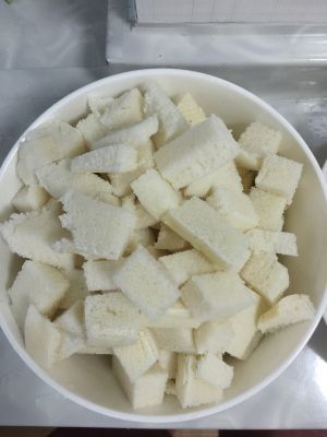 馒头2个,在冰箱软冷冻1晚上的,拿出来室温稍微放置一会,其他配菜洗好就可以切了,不会太冰手,硬度也适中。切成小块。