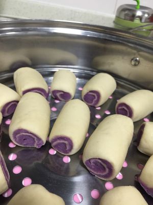 把和好的面团取三分之一 加入紫薯200g(紫薯要先去皮蒸熟 压成泥状)揉匀
