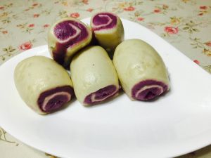 把发酵后的白面团揉好 杆成长条形的皮 同理 把紫薯面团揉好杆成长条的皮 上下叠放好 卷起来