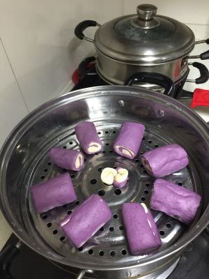 首先将紫薯削皮,冷水上蒸锅里蒸熟取出捣碎放冷备用!