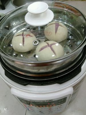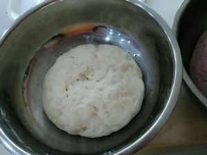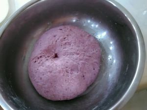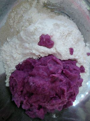 先用料理机加上牛奶、熟紫薯打成紫薯牛奶泥。然后在面粉中加入酵母丶紫薯牛奶泥、白糖和成紫面团。