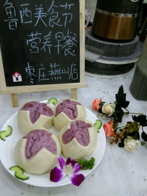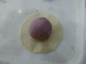 紫面也搓成大小均匀的小剂子团成面团。在用白面剂子擀成圆片包入紫色面团团成馒头坯子