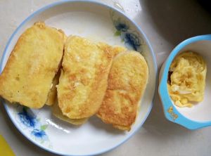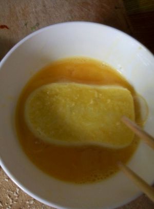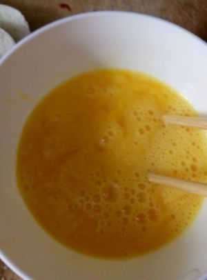 蛋液打散, 将切好的馒头丁放进去, 尽量均匀的裹好蛋液. 一个鸡蛋就够了.
