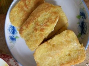 裹好蛋液的馒头丁下锅, 小火翻炒.