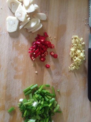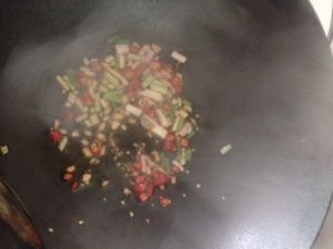 开小火,把辅料放进锅中煸香,葱花放准备的1/3