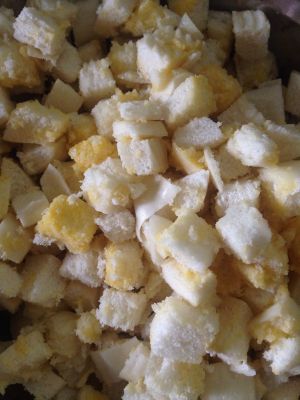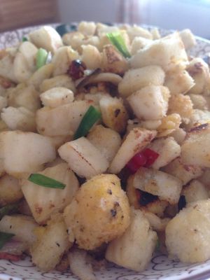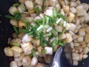 把馍块放进去,翻几下,加上葱花,放入盐和胡椒炒制有点焦装即可出锅