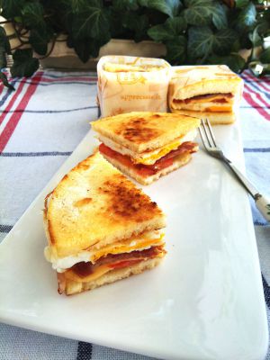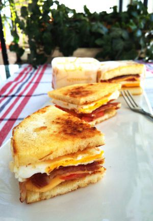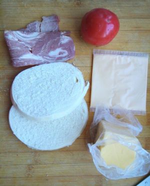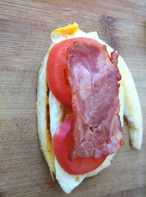 铺上切好的西红柿片,培根。喜欢千岛酱的可以涂少许