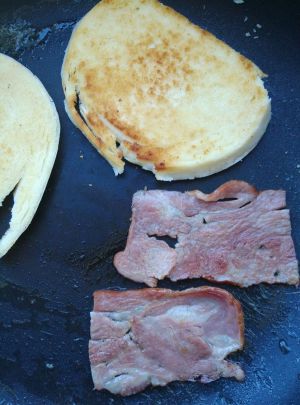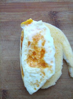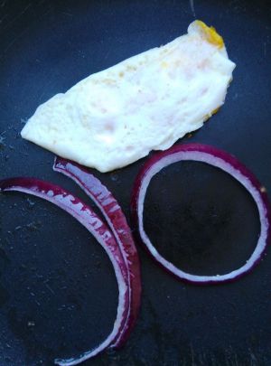 晾馒头片的同时,小火煎蛋和洋葱圈。煎蛋上可洒少许黑胡椒粉