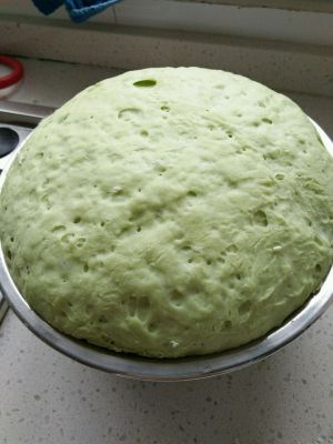 在适量温水中,加适量酵母,加一包青汁,再倒入适量的小麦面粉。搅拌均匀成糊状,在温暖的电饭锅里醒发一个小时后,再加入适量面粉再醒发半个小时,就如图上所示。 然后,再加入面粉适量,搅拌揉捏到不粘手。