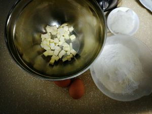 把馒头切成小块,葱白切碎,碗里打一个鸡蛋
