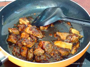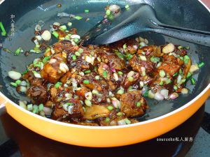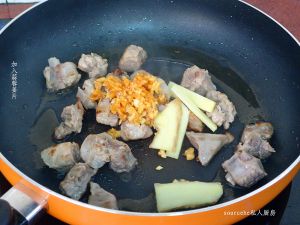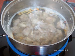 上色以后,放入葱姜蒜,桂皮八角陈皮香叶,一起炒出香味。然后加入高汤(或热水)。转入砂锅小火顿两个小时左右