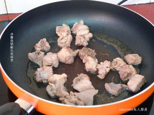 热锅,放油,放入冰糖炒糖色,等油锅里起泡沫,颜色开始变黄,倒入排骨,PS:冰糖融化的时间约30秒到一分钟,看火的大小,还有锅的不同。