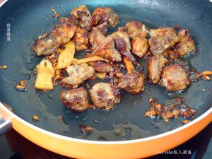煸炒数下,将排骨均匀裹上糖色,排骨煎微黄;PS:排骨煎到微黄约2-5分钟;